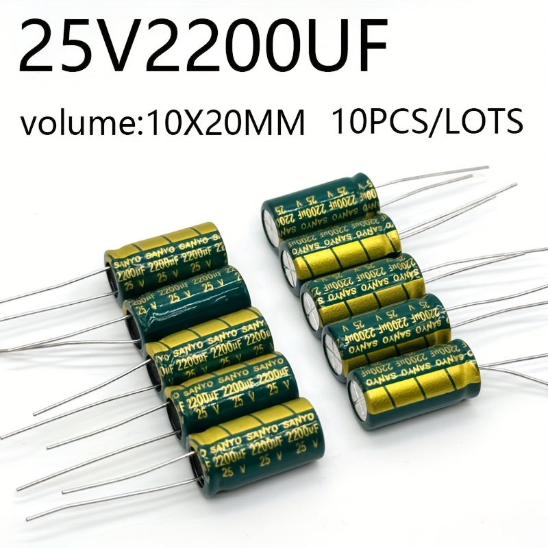 Алюмінієвий електролітичний конденсатор 2200 мкФ 25 В, 10 шт, 105°C – високоякісний комплект для застосування в електронних схемах, блоках живлення, промислових та побутових пристроях. Конденсатори забезпечують стабільну роботу при високих температурах і допустимих перепадах напруги, що робить їх незамінними для радіоаматорських і професійних проектів.