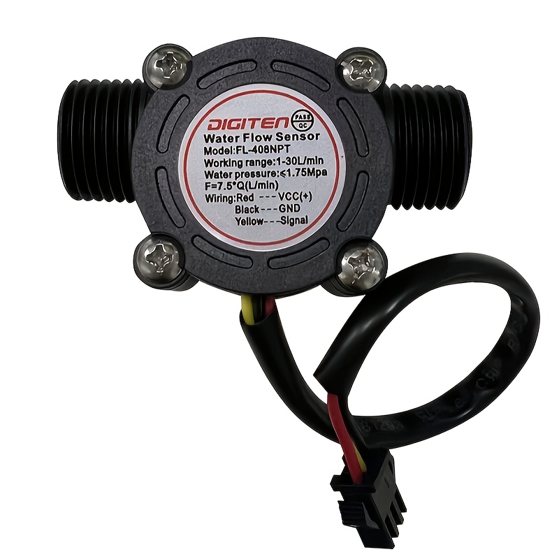 Конструктивно датчик складається з міцного пластикового корпусу, вбудованого клапана, водяного ротора та чутливого датчика Холла. Коли вода проходить крізь корпус, ротор починає обертатися, і швидкість його обертання прямо залежить від сили потоку. Датчик Холла фіксує ці зміни та формує імпульсний сигнал, частота якого пропорційна витраті води. Це дозволяє точно визначати об’єм рідини, що пройшла через систему.